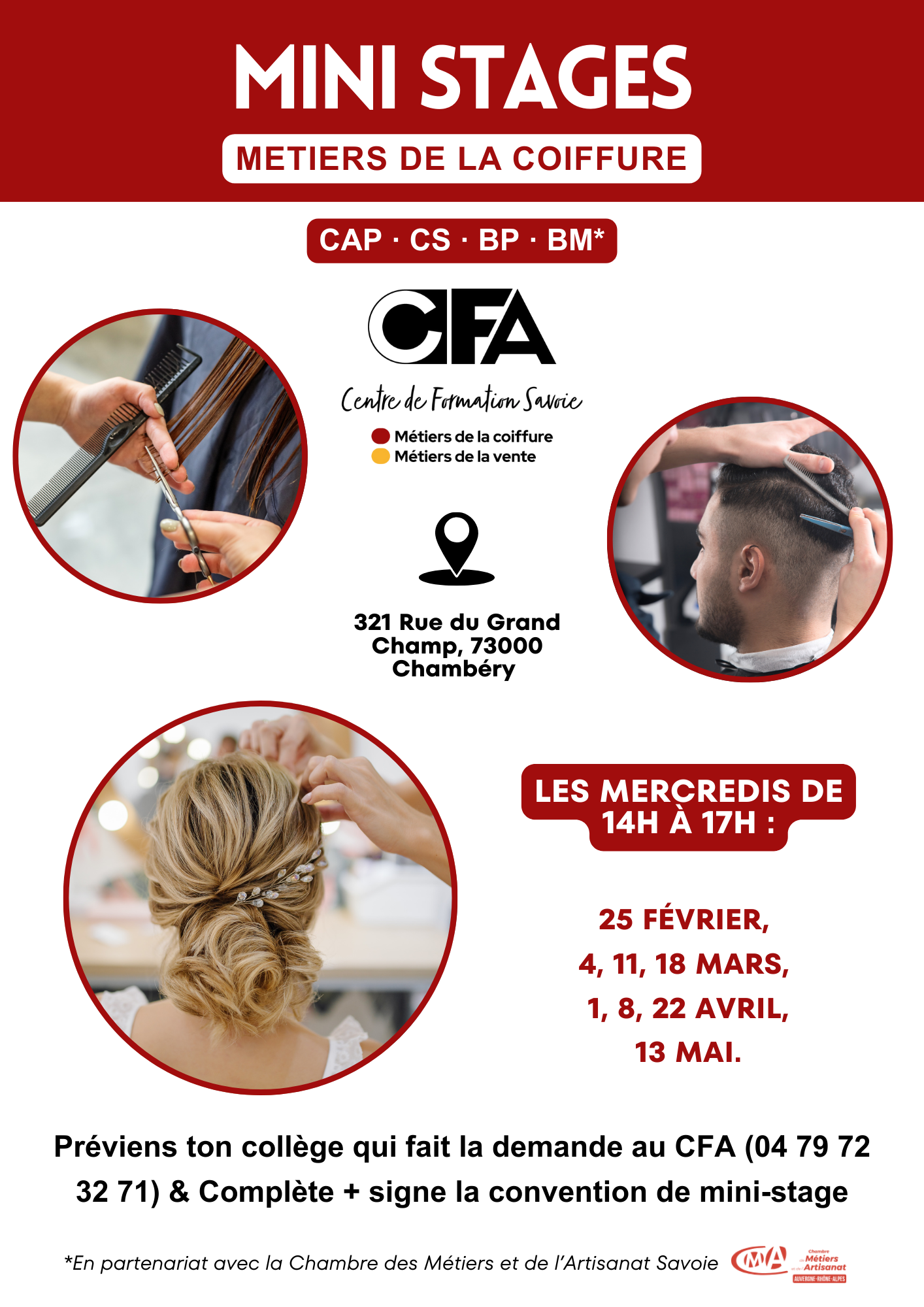 📍 Ces mini-stages se déroulent au CFA Coiffure & Vente de Chambéry, sur des demi-journées.